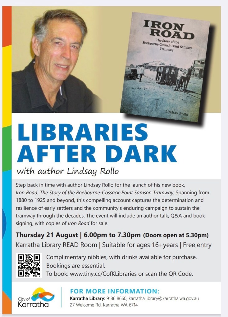 I am pleased to announce that the City of Karratha has agreed to host the launch of my new book, Iron Road – The Story of the Roebourne-Cossack-Point Samson Tramway at the Community Centre on the 21st of August 2025. Given that Karratha today is the administrative centre for the West Pilbara and incorporates the townships of Roebourne, Cossack, and Point Samson, it is the obvious choice for the launch of my new book. I am very grateful to the City of Karratha for their support and look forward with great excitement to this event.